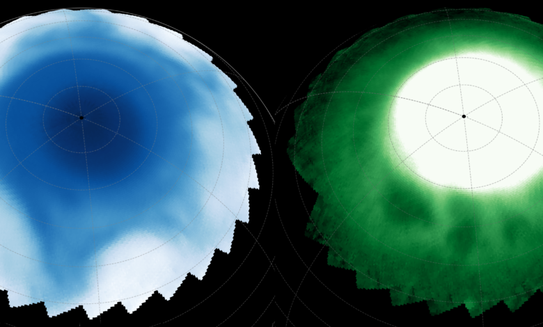 The astronomers expected to see emissions across broad bands of the infrared spectrum in the atmospheric layers above the vortex. Yet what they noticed instead were dark, bead-like features — separated by vast distances yet possibly interconnected — drifting slowly in the charged plasma of the planet’s ionosphere, and a lopsided star-shape structure in the stratosphere beneath. They published their findings Aug. 28 in the journal Geophysical Research Letters.