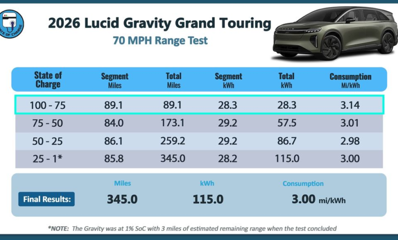 But the work from the Gravity isn’t quite as inspiring. It managed 345 miles of highway driving at 3.0 miles per kWh, which is not only far below estimates but not exactly mind-blowing efficiency from Lucid. While it’s unreasonable to expect an SUV to pull the same 4.0-plus ratings as the Air sedan, the carmaker did claim a target of about 3.6 miles per kWh. Not exactly what Tom got here.